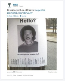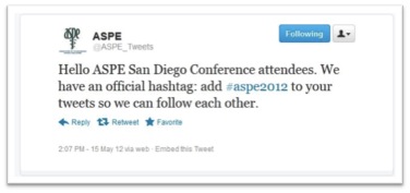 All you do is compose a tweet and add “#aspe2012” at the end. Then we can search for and follow your tweets.